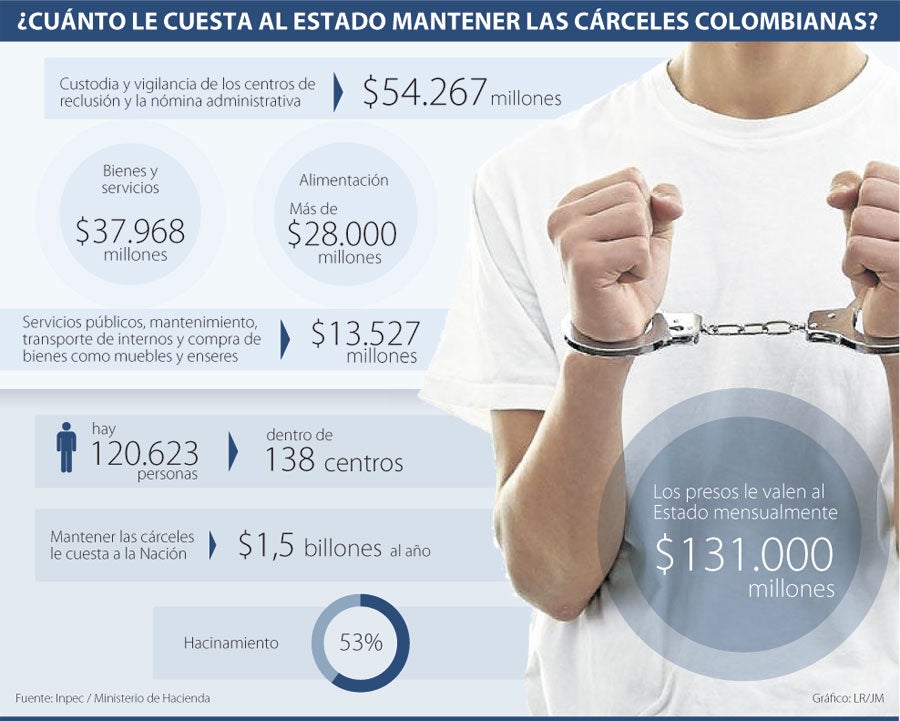 De acuerdo con el Instituto Nacional Penitenciario y Carcelario (Inpec) en Colombia hay 120.623 personas privadas de la libertad dentro de 138 centros penitenciarios que le cuestan a la Nación $1,5 billones al año, es decir por cada uno de los reclusos se pagan $13,1 millones cada 12 meses.