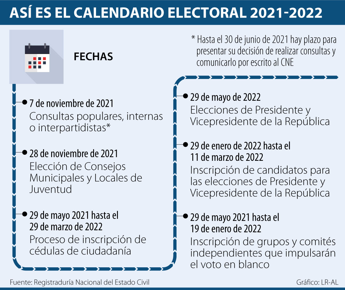 Quedó definido el calendario electoral para 2021 y 2022, según informó la Registraduría Nacional del Estado Civil. De esta manera quedaron listas las fechas para tres procesos importantes para la ciudadanía, estos son: las elecciones de Presidente y Vicepresidente de la República; las consultas populares, internas o interpartidistas; y la elección de los Consejos Municipales y Locales de Juventud.