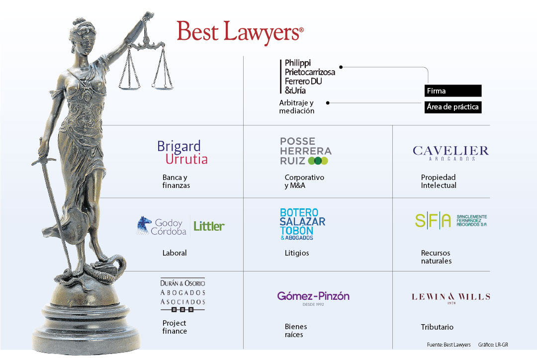 Entre las firmas destacadas por Best Lawyers está Phillippi Prietocarrizona Ferrero DU & Uría, que fue reconocida en el área de arbitraje. Brigard Urrutia también está en el top por su desempeño en la práctica de banca y finanzas. Del mismo modo, por su área de derecho corporativo y M&A, Posse Herrera Ruiz destaca como la mejor firma en esa área.