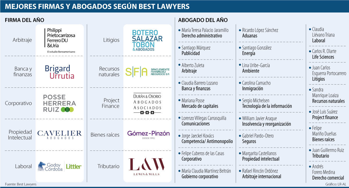 Para esta entrega, Best Lawyers también calificó el desempeño profesional de varios abogados del país. En ese sentido, destacó el trabajo de 26 profesionales (vea el listado completo de los abogados del año en el gráfico) como María Teresa Palacio Jaramillo (Palacio Jouve & García Abogados), por su desempeño en derecho administrativo. Por temas relacionados con publicidad, Santiago Márquez (Márquez-Robledo Abogados) también fue tenido en cuenta como abogado del año; Claudia Barrero Lozano (PPU) fue destacada en banca y finanzas, así como Mariana Posse (Posse Herrera Ruiz) fue reconocida por su trabajo en el área de mercado de capitales durante este año.