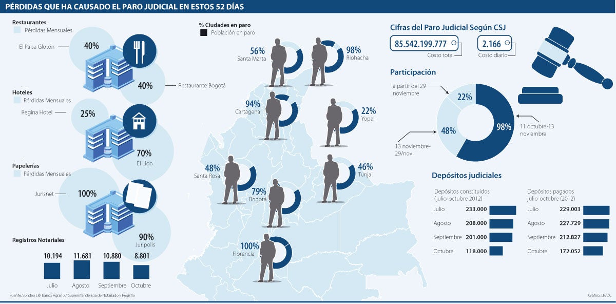 Pero en estas cuentas no entran las de los establecimientos comerciales, pequeños negocios en su mayoría, apostados siempre a los alrededores de los complejos judiciales, a los cuales dicha parálisis, que en algunas zonas del país incluyendo Bogotá ajusta ya 52 días, también los tiene quietos.