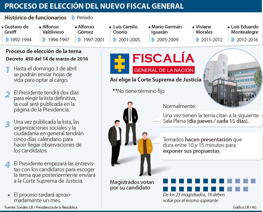Si usted cumple con los requisitos para ser fiscal (ser colombiano, abogado, no ha sido condenado a pena privativa de la libertad y ha ejercido por 15 años cargos en la Rama Judicial, entre otros) le quedan cinco días para enviar su hoja de vida para ser elegido por el presidente, Juan Manuel Santos, como uno de los tres candidatos. Tras este tiempo, el mandatario depurará una la lista, la publicará y luego de recibir comentarios de organizaciones civiles y de ciudadanía en general, empezará con entrevistas.
