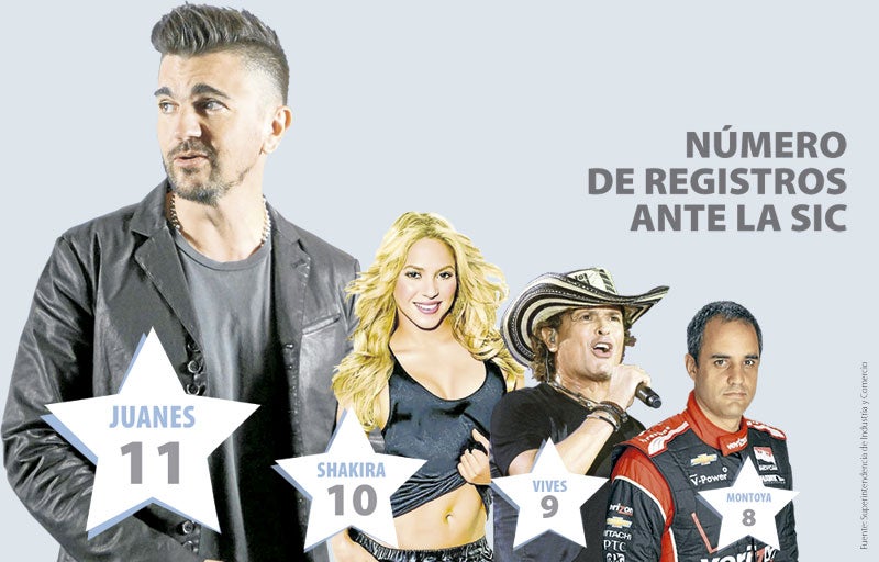 En Colombia, Juanes, Shakira y Carlos Vives han impuesto una tendencia y es que entre ellos se han registrado 30 marcas. El top 10 de artistas nacionales tiene 75 beneficios concedidos por la Superintendencia de Industria y Comercio, SIC.