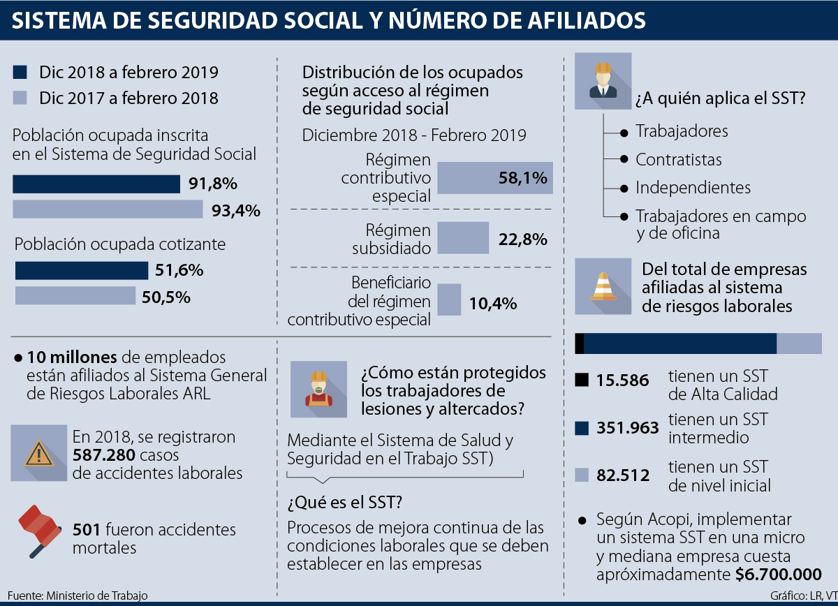 De acuerdo con los reportes de las Aseguradoras de Riesgos Laborales (ARL), el año pasado se registraron 587.280 accidentes laborales de los que 501 fueron mortales. Alicia Arango, ministra de Trabajo, ha manifestado que una de las principales apuestas de su cartera es reducir la accidentalidad y mortandad en los lugares de trabajo para lo que la ley ha contemplado la ampliación de los estándares mínimos de los sistemas de seguridad y salud en el trabajo y la cobertura sobre los derechos de los empleados.