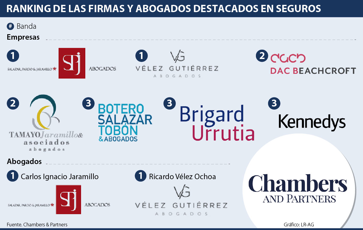 Las firmas Salazar Pardo & Jaramillo Abogados y Vélez Gutiérrez Abogados según el ranking, están entre los mejores bufetes en derecho de seguros pues se ubicaron en la Banda uno.