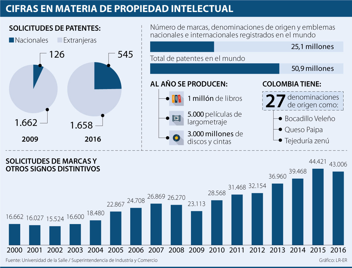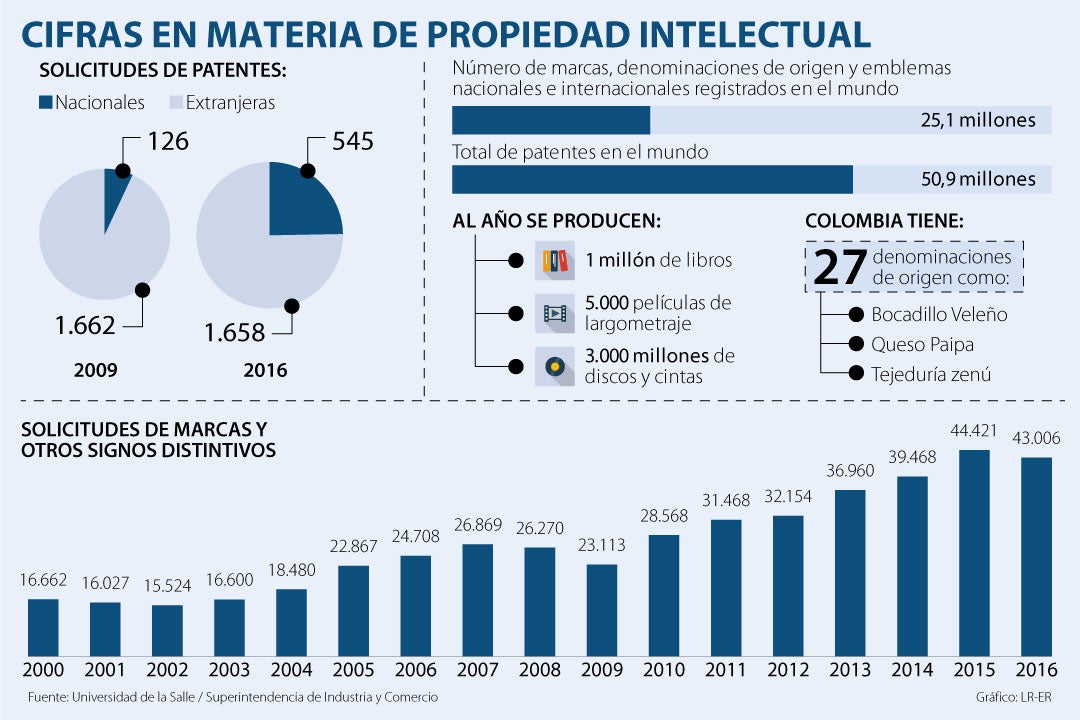 Según el más reciente reporte en materia de propiedad intelectual en Colombia, elaborado por la Superintendencia de Industria y Comercio, los registros de obras literarias inéditas y los registros de obra musical son los más solicitados, con 44% y 27%, respectivamente, motivo por el que cada vez se hace más importante la protección de los derechos de autor. De la misma forma, la SIC destacó que mientras en 2009 se hicieron 23.113 solicitudes de registro de marcas, en 2016 se realizaron 43.006.