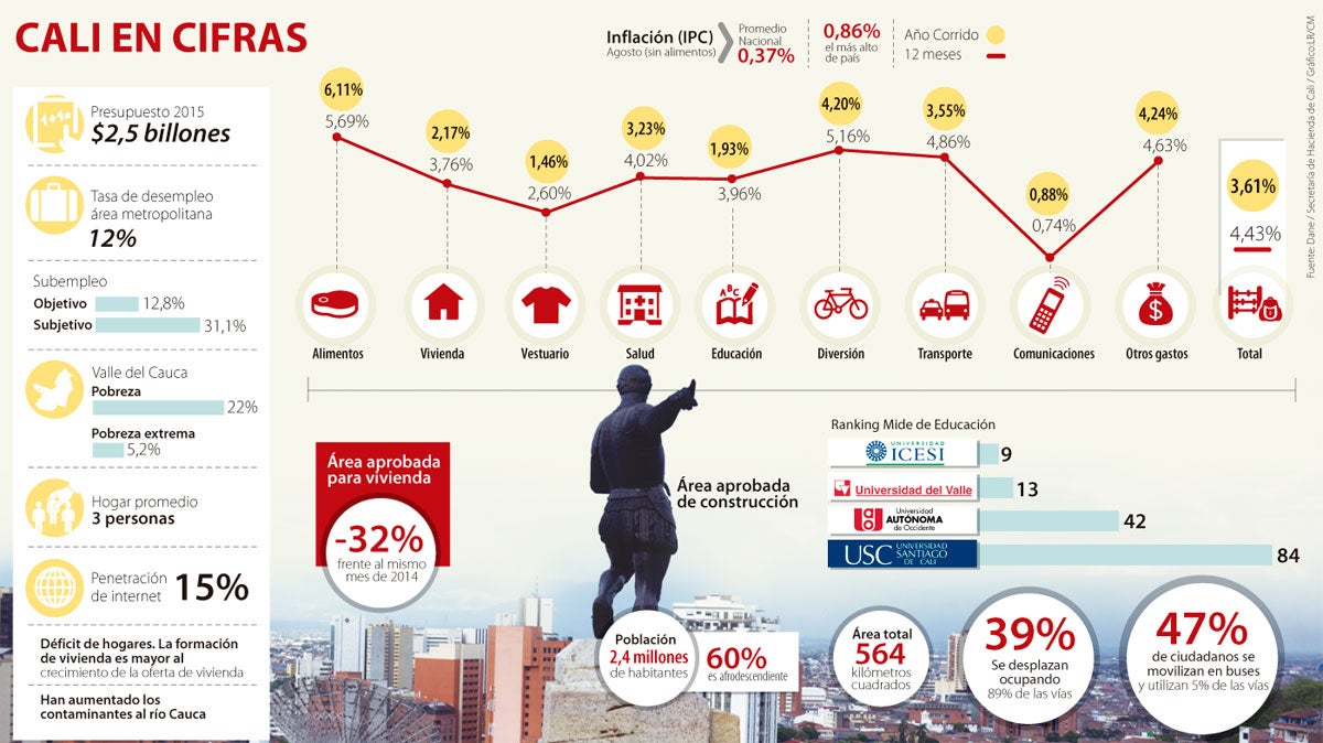 Cali maneja un presupuesto de 2,5 billones que se invierten en un área total de 564 kilómetros cuadrados (km2). Además, posee parte importante del PIB del Valle, que aporta 9% al nacional. Para 2016, el presupuesto que podría gastar la Alcaldía estaría entre los $2,5 billones y $3 billones.