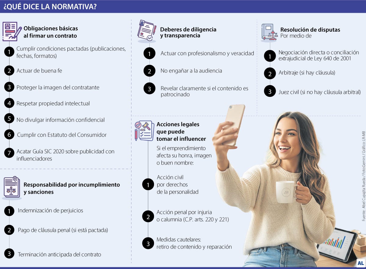 Pero ojo: un influencer que no cumpla con las regulaciones impuestas por la SIC u otros organismos podrá enfrentar sanciones y multas por hasta $2.320 millones de hallarse culpables en la investigación. Pero existen otros deberes. Abel Cupajita, socio y director de Sescol Tax & Legal Abogados, explicó que, al firmar un contrato con un emprendimiento o marca, el influencer adquiere obligaciones similares a cualquier contratista. Estos, por lo general, son cumplir con las condiciones pactadas (publicaciones, fechas, formatos y mensajes), actuar de buena fe, proteger la imagen del contratante, respetar derechos de propiedad intelectual, y no divulgar información confidencial. “Además, la persona debe cumplir con las normas de publicidad y consumo, es decir, la Ley 1480 de 2011 y con la Guía de Buenas Prácticas en la Publicidad a Través de los Influenciadores de agosto de 2020 de la SIC”, aseguró Cupajita.