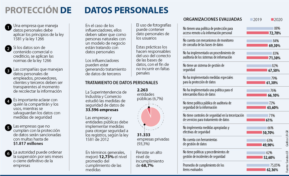 Colombia tiene muchas falencias en la protección de este tipo de datos, pues uno de los últimos reportes de la Superintendencia de Industria y Comercio reveló que 33.596 empresas encuestadas tienen un incumplimiento de políticas de protección de datos que asciende a 68,7%. Si bien se trató de una mejora de 12,73% comparado con 2019, pues en ese año hubo 75% en incumplimiento, falta un largo trecho para establecer óptimas herramientas de gestión de datos.