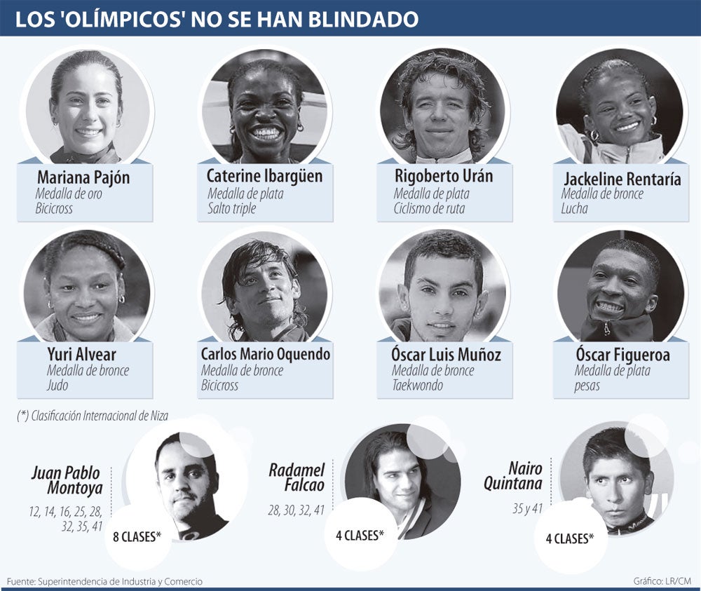 Mariana Pajón, Caterine Ibargüen, Rigoberto Urán, Jackeline Rentaría,Yuri Alvear, Carlos Mario Oquendo, Óscar Luis Muñoz y Óscar Figueroa brillaron como las estrellas del deporte nacional en el último encuentro deportivo más importante del mundo en Londres, pero también lo hicieron, por su ausencia en los archivos del órgano dirigido por Pablo Felipe Robledo y ninguno se ha hecho a su registro marcario.
