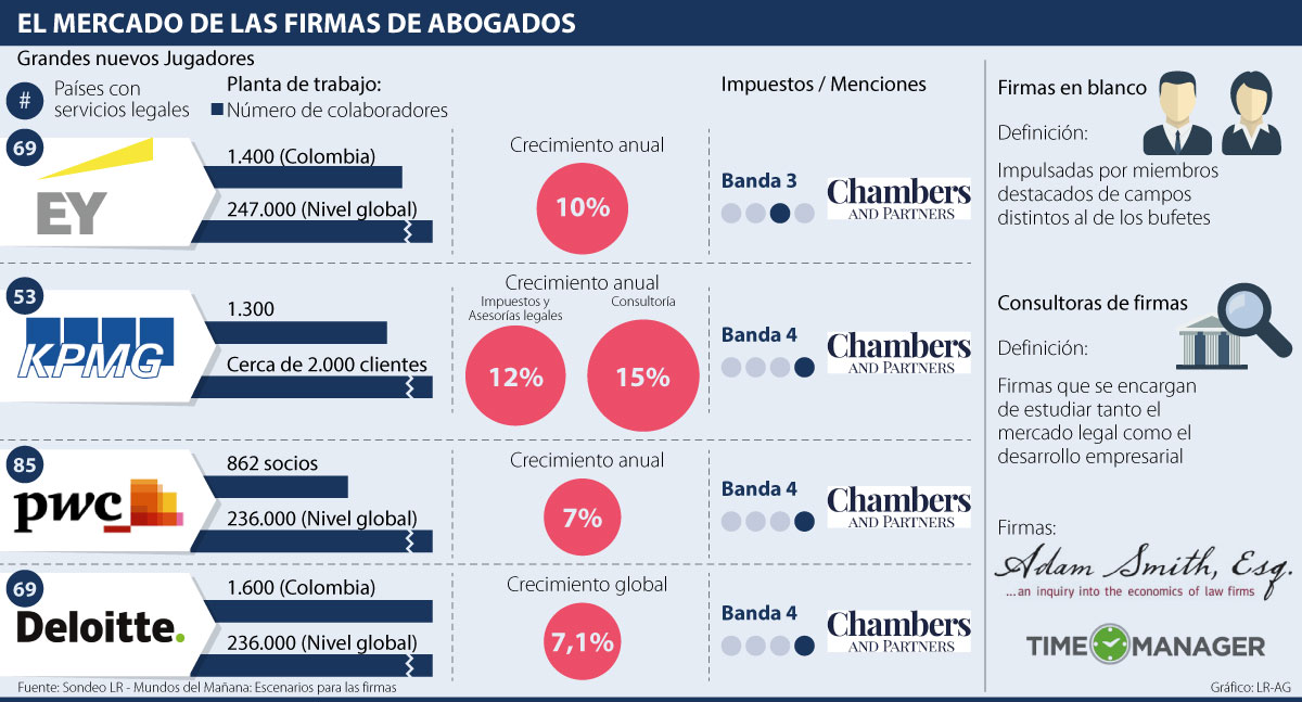 En el sector de las firmas de abogados se ha registrado un auge de tres tipos de actores que se han ido consolidando tanto en los mercados internacionales como en el campo local. Estos actores son: el área legal de las Big Four; las denominadas firmas de abogados “en blanco” y las consultoras independientes de bufetes legales.