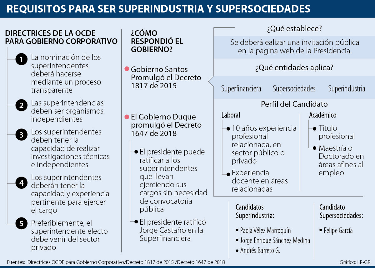 Por criterios de la Ocde, el presidente Santos promulgó el Decreto 1817 de 2015, donde se define el perfil de los dirigentes de las superintendencias de Sociedades, Financiera y de Industria. El decreto estableció que los nuevos superintendentes deben tener un título profesional afín con el área de trabajo, haber cursado una maestría o doctorado relacionado con el objeto de la entidad y debe contar con 10 años de experiencia profesional en línea con el cargo a desempeñar. Estableció que el período de trabajo será de cuatro años y que el presidente únicamente podrá retirarlos del cargo, cuando exista una casual que lo motive.