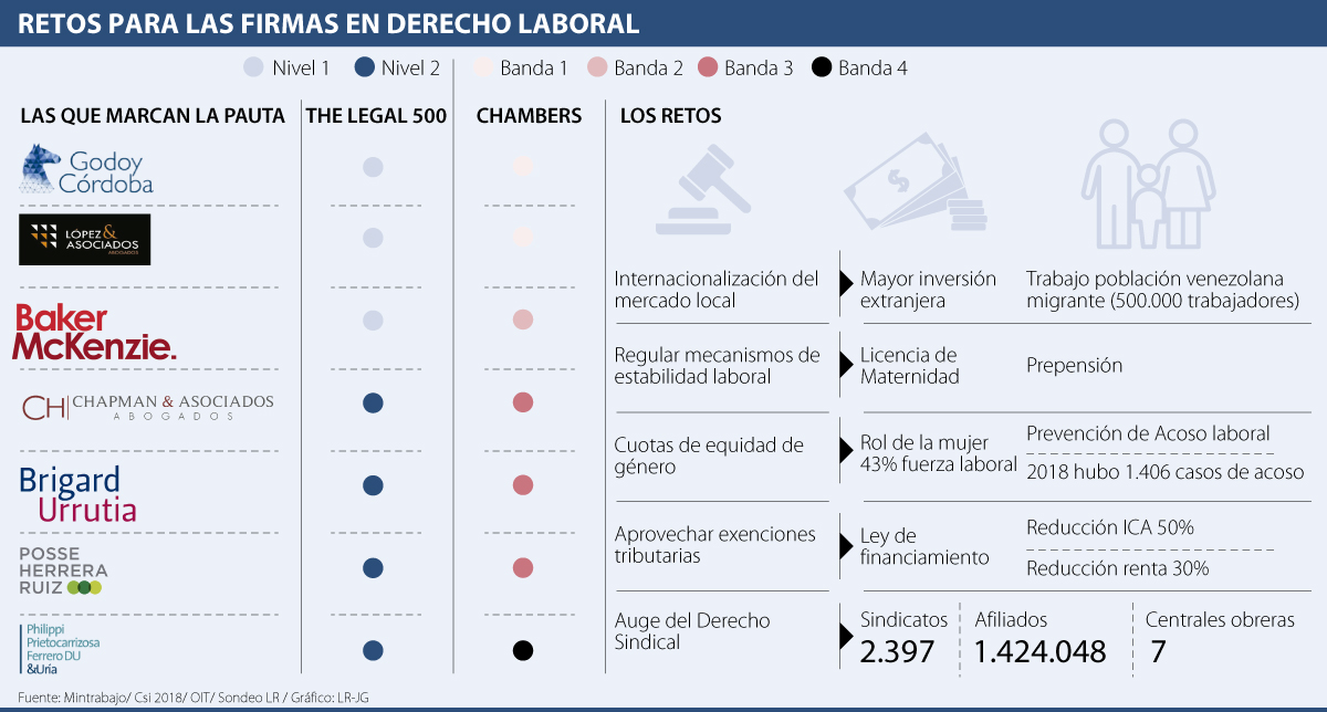 El campo del derecho laboral es uno de los que más modificaciones ha sufrido con el ingreso de Colombia en el grupo de países de la Ocde. Los retos que deberán afrontar las firmas de abogados para el próximo año se centran en reforzar la defensa de derechos sindicales y aplicar la normativa para reducir las inequidades de género en el campo laboral. Sectores critican que el Gobierno no realizó ninguna propuesta en este segmento dentro de la reforma a la justicia.