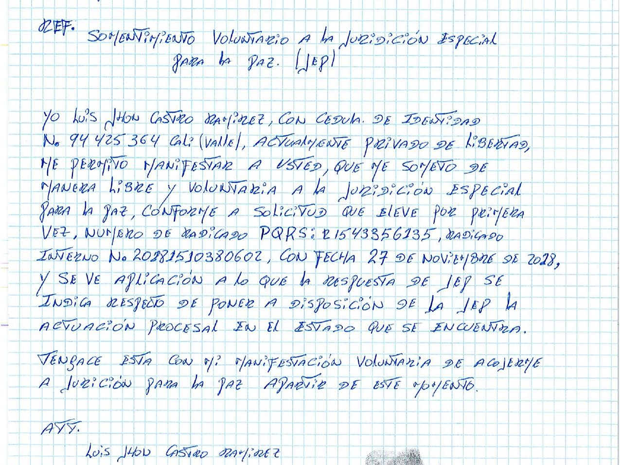 Luis Jhon Castro, alias 'El Zarco', solicitó sometimiento ante la JEP mediante una carta