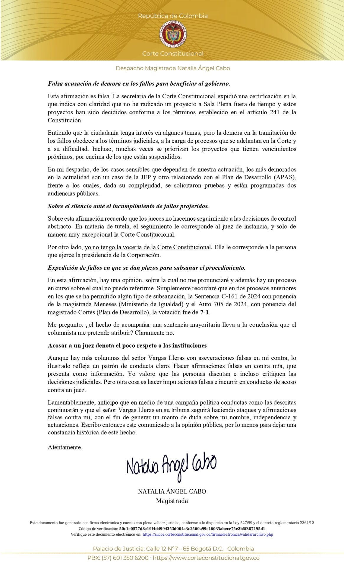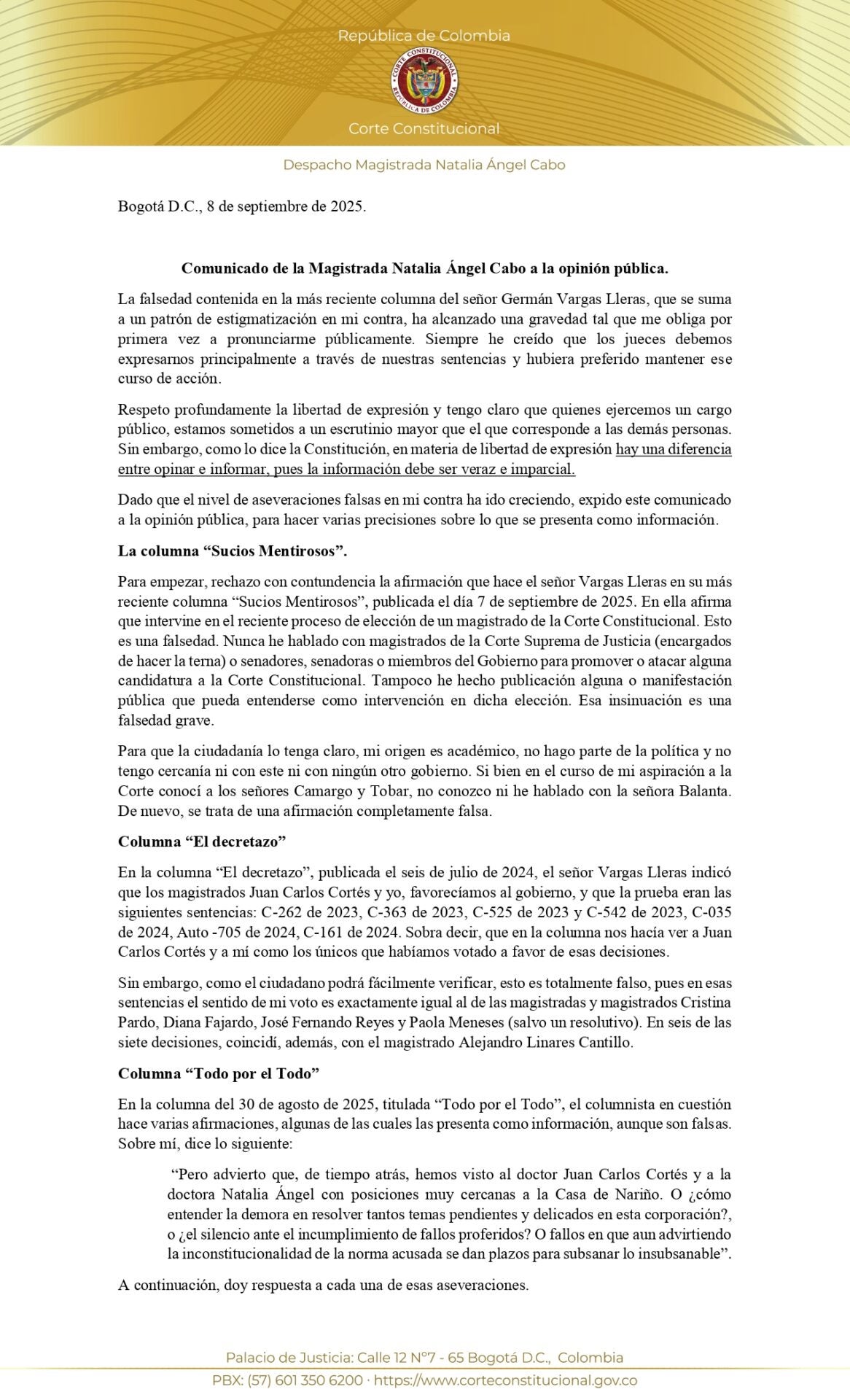La magistrada de la Corte Constitucional, Natalia Ángel Cabo, publicó un comunicado en respuesta a la más reciente columna escrita por el el exvicepresidente Germán Vargas Lleras y desmintió que algunas decisiones judiciales favorecieran al Gobierno o que interviniera en la elección de Carlos Camargo como nuevo miembro del alto tribunal.