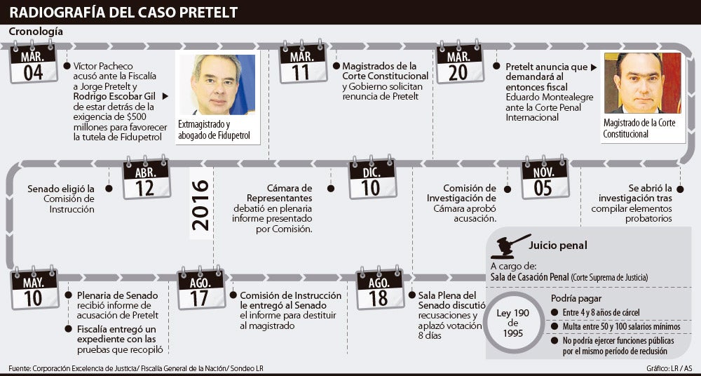 Cabe recordar, que Pretelt es investigado por la Comisión de Acusaciones de la Cámara de Representantes desde marzo de 2015, tras conocerse que le habría pedido $500 millones al abogado de Fidupetrol, Víctor Pacheco, para fallar a favor de una tutela que había interpuesto para evitar que Fidupetrol se librara de un pago de $22.500 millones al departamento de Casanare por manejos irregulares de regalías.