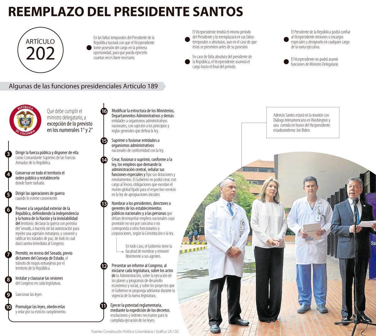 “Si Santos solo se realiza unos chequeos médicos, estará con todas las facultades plenas. En caso de una licencia médica el presidente puede dejar encargado a alguien como por ejemplo un ministro por dos o tres días. Las funciones presidenciales del vicepresidente se pueden tomar en caso que el presidente las delegue por un caso de calamidad o vacaciones y ausencia absoluta” resaltó el experto.