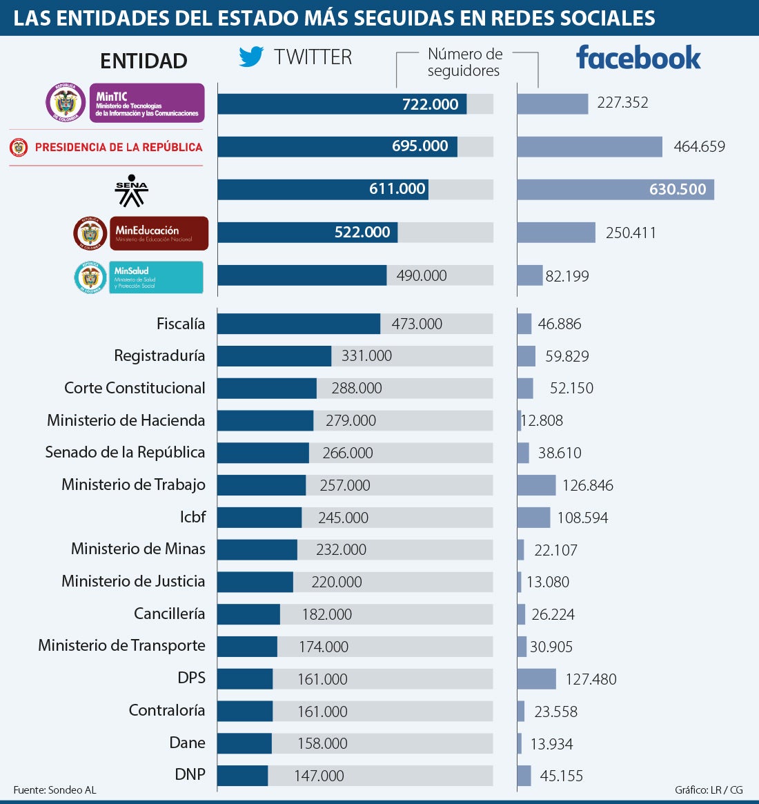 Luego de revisar la página de Twitter y Facebook en una muestra aleatoria simple de varios organismos estatales, AL encontró los 20 entes con mayor número de seguidores, sin contar a los de la fuerza pública. Si se tiene en cuenta el número de usuarios en Twitter, el top tres está integrado por el Ministerio de las TIC, con 722.000 seguidores; la Presidencia de la República, con 695.000; y el Servicio Nacional de Aprendizaje, con 611.000.