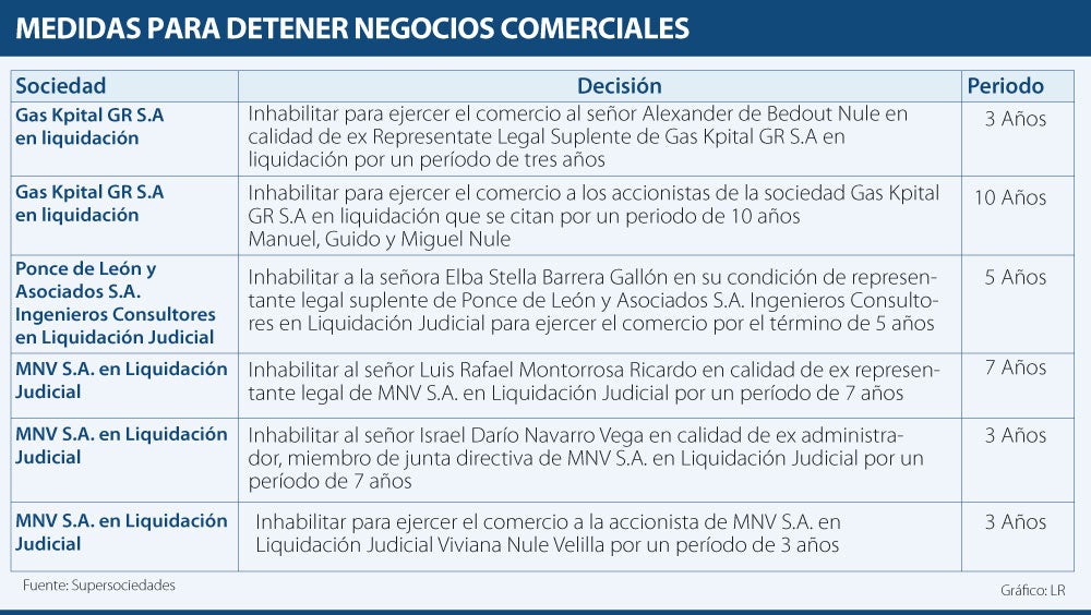 En el caso de Viviana Nule Velilla, accionista de MNV; Israel Darío Navarro Vega, ex administrador y miembro de junta directiva de Gas Kpital GR S.A en liquidación; y Alexander de Bedout Nule, representante Legal Suplente de Gas Kpital GR S.A la Superintendencia de Sociedades los inhabilitó para ejercer el comercio por un período de tres años cada uno. Igual inhabilidad se decretó para Israel Darío Navarro Vega, ex administrador, miembro de junta directiva de MNV S.A.; y para Hitler Calderón Oñate, ex administrador, miembro de junta directiva de la sociedad MNV S.A.