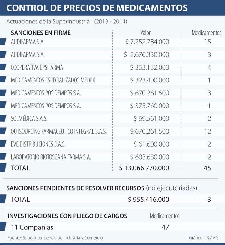 En este momento, investigan 12 farmacéuticas por sobrepasar los límites de precios de 47 medicamentos. Sanofi Aventis de Colombia es la que más investigaciones tiene abiertas, por 10 medicamentos; seguido por Cooperativa Epsifarma, por nueve; y Farmasánitas, por ocho.