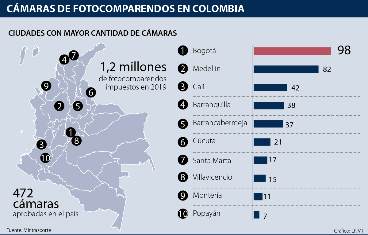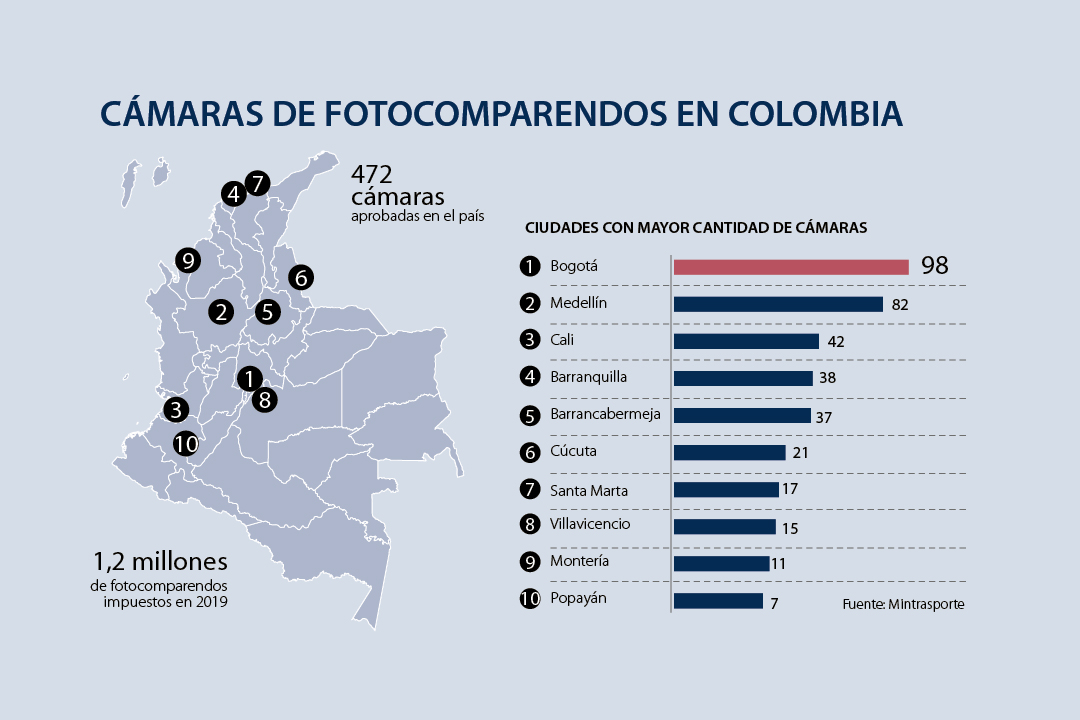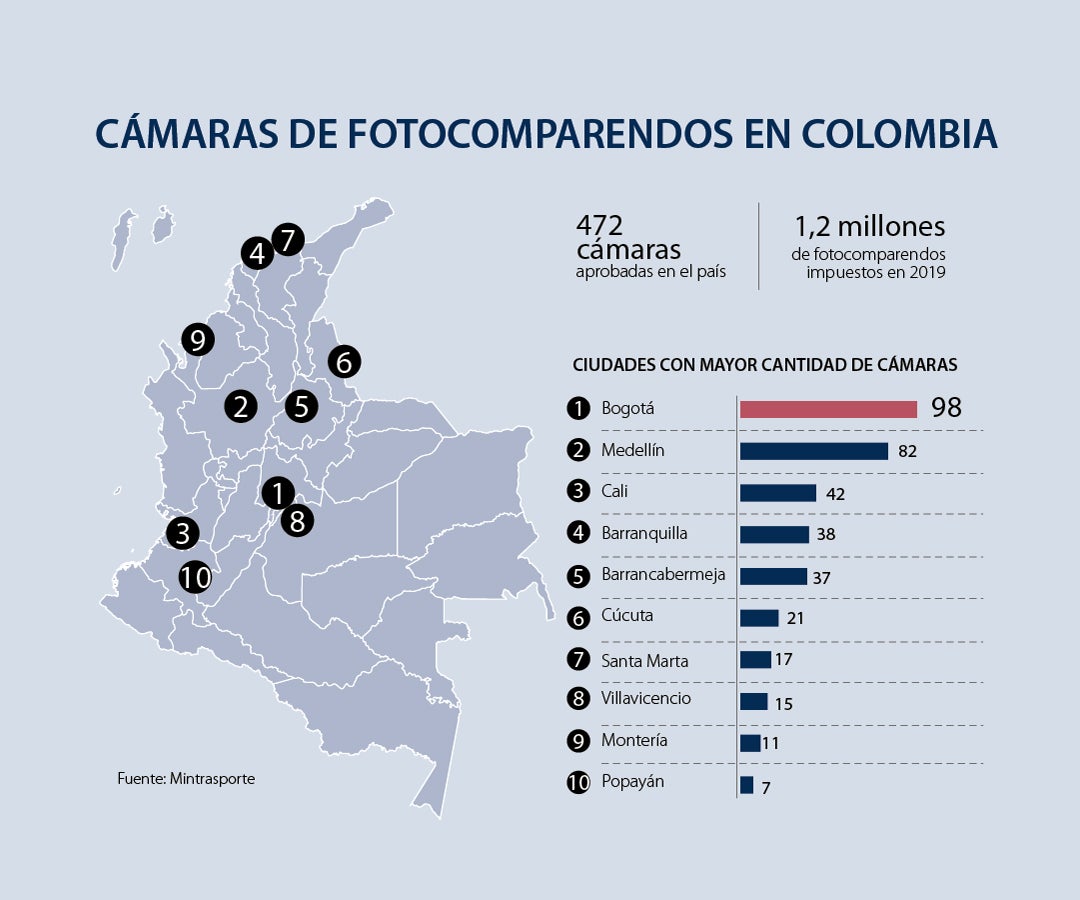 En total, a final de año se completaron 1,2 millones de comparendos y en lo corrido del año se han impuesto 115.583 comparendos por fotodetección a nivel nacional. Esta lista la lidera Cali, donde se han puesto 17.500 y es seguida nuevamente por la capital, donde se han puesto 10.784. En el departamento del Atlántico se han impuesto 9.019 comparendos este año y en Barranquilla han sido 8.648, seguida por Aguachica donde la cifra se ubica en 6.629.