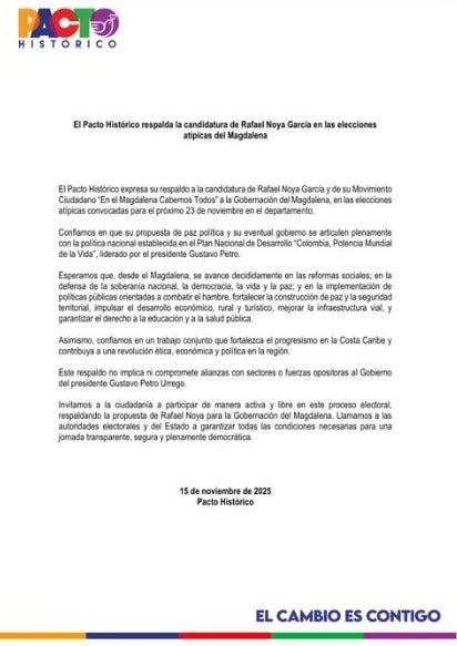 El Pacto Histórico anunció oficialmente su respaldo a la candidatura de Rafael Noya García y del movimiento “En el Magdalena Cabemos Todos” para la Gobernación del Magdalena, en el marco de las elecciones atípicas que se realizarán el próximo 23 de noviembre.