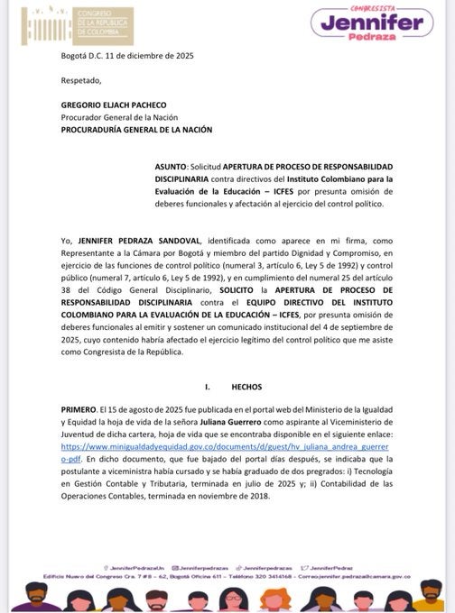 “Solicito la apertura de proceso de responsabilidad disciplinaria contra el equipo directivo del Instituto Colombiano para la Evaluación de la Educación, Icfes, por presuntamente haber omitido deberes funcionales al emitir y sostener un comunicado institucional del 4 de septiembre de 2025, cuyo contenido habría afectado el adecuado ejercicio del control político que me asiste como congresista de la República”, sustentó Pedraza en la misiva.