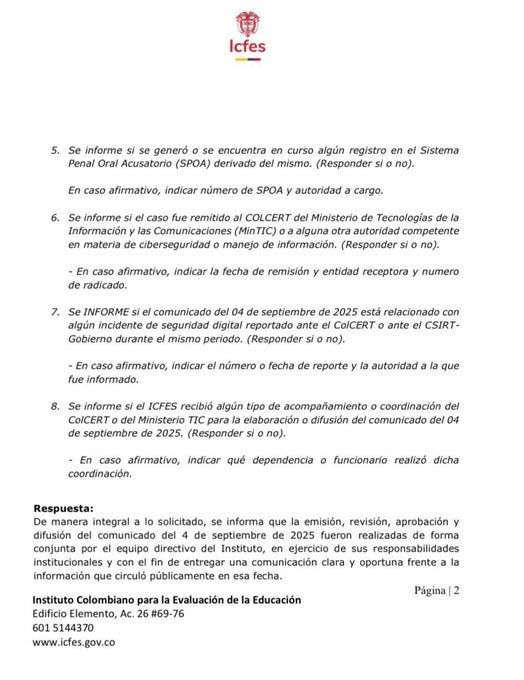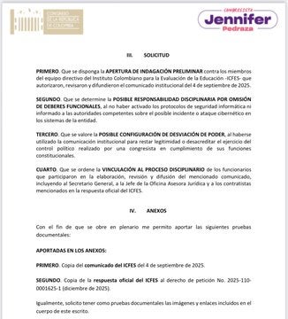 Dentro de lo que pidió Pedraza que se lograra con la investigación destaca que, “ que se determine la posible responsabilidad disciplinaria por omisión de deberes funcionales, al haber omitido los protocolos de seguridad informática en la administración del sistema de información de resultados del Examen Saber 11” y “que se indague la posible configuración de desviación de poder, al haberse utilizado la comunicación institucional para registrar información desactualizada o incorrecta sobre la base de resultados, con aparente propósito de afectar el cumplimiento de mis funciones constitucionales como congresista”.