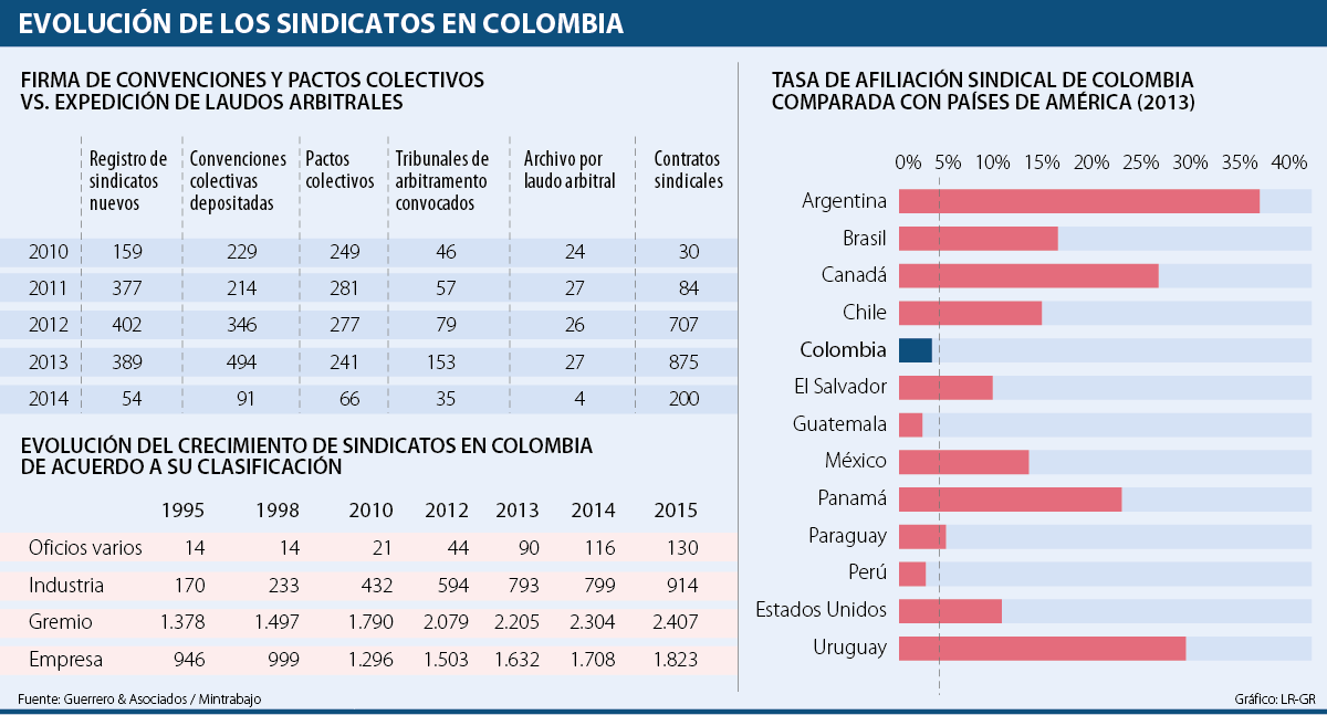 En Colombia estas asociaciones de trabajadores constituidas para el estudio, desarrollo y defensa de los intereses laborales de los trabajadores, han crecido principalmente en el sector industrial. De acuerdo con datos del Mintrabajo, mientras en 1995 había 170 sindicatos industriales, en 2015 se registraron 914, seguidos de las asociaciones gremiales, que son las que tienen los números históricos más altos, como por ejemplo el de Fecode, el sindicato de maestros.