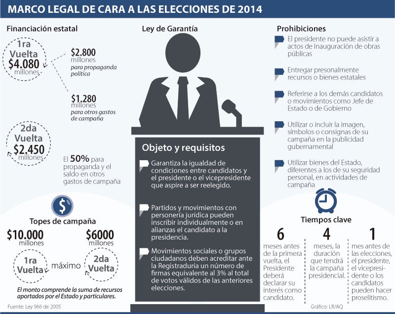 La Ley 966 o de Garantías dispone que cuando el Presidente en ejercicio quiera ser candidato, deberá hacerlo oficial “seis meses antes de la votación de la primera vuelta”. Esta, en el caso del próximo año, se efectuará el domingo 24 de mayo, después de las de Senado y Cámara que se realizarán el 9 de marzo. Y, como en el caso de Gobernadores y Alcaldes no se aprobó la reelección, sólo es aplicable hasta ahora para la campaña presidencial.
