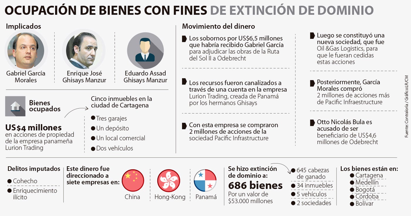 Ayer materializó medidas cautelares sobre siete bienes (cinco inmuebles y dos vehículos) y cuatro millones de acciones de la empresa Pacific Infrastructure, valoradas en cerca de US$4 millones, todo esto, propiedad de los hermanos Enrique José y Eduardo Assad Ghisays, y el exviceministro Gabriel García Morales, acusado de recibir sobornos de Odebrecht en la adjudicación del contrato de la Ruta del Sol II.