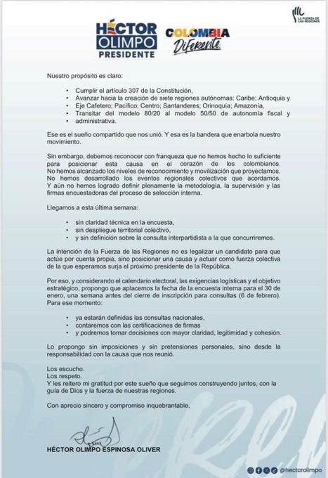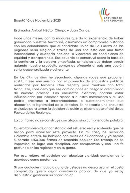 El exgobernador Juan Guillermo Zuluaga expresó a través de una carta que, “asumimos un compromiso histórico con los colombianos: que el candidato único de La Fuerza de las Regiones sería elegido a través de una encuesta con una firma internacional y auditoría nacional o viceversa (...) En los últimos días he escuchado algunas voces que proponen sustituir ese mecanismo por el promedio de encuestas públicas realizadas por terceros”.