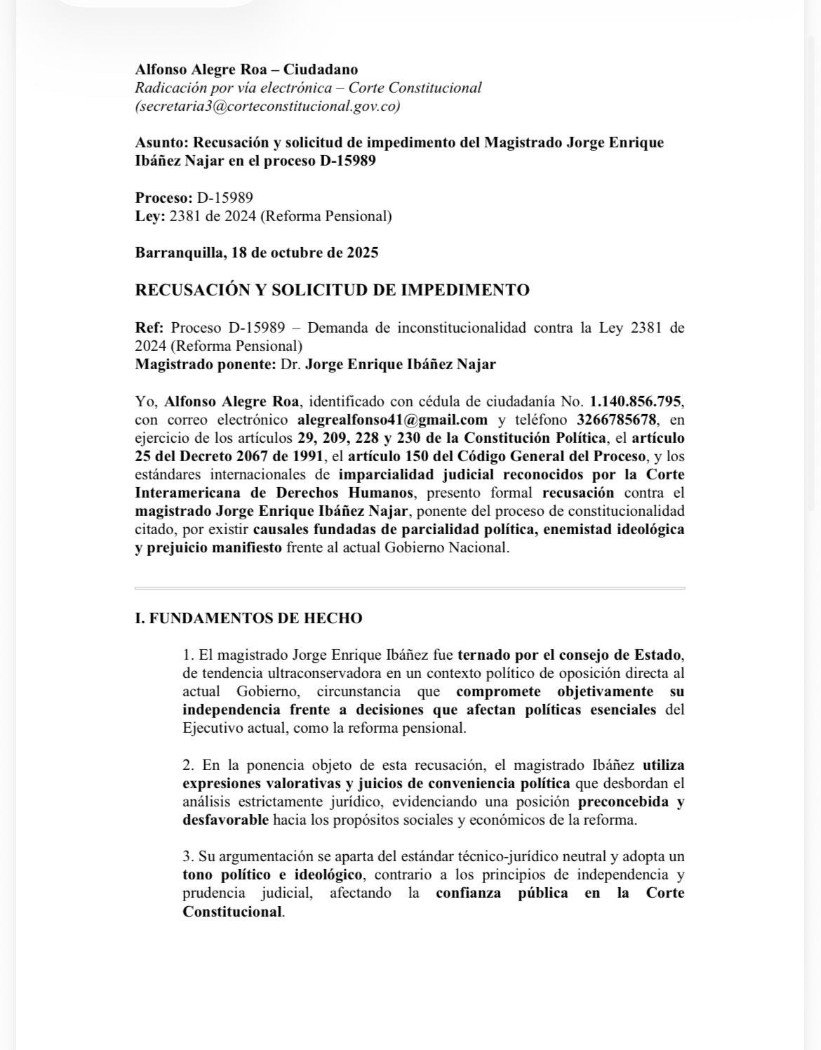 Se presentó ante la Corte Constitucional una recusación en contra del magistrado Jorge Enrique Ibáñez para su desvinculación del caso de la reforma personal por presuntos intereses políticos y falta de imparcialidad.