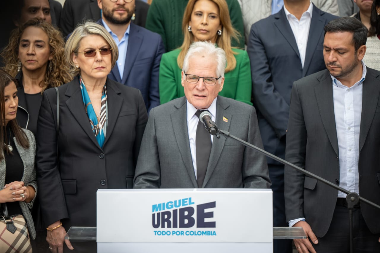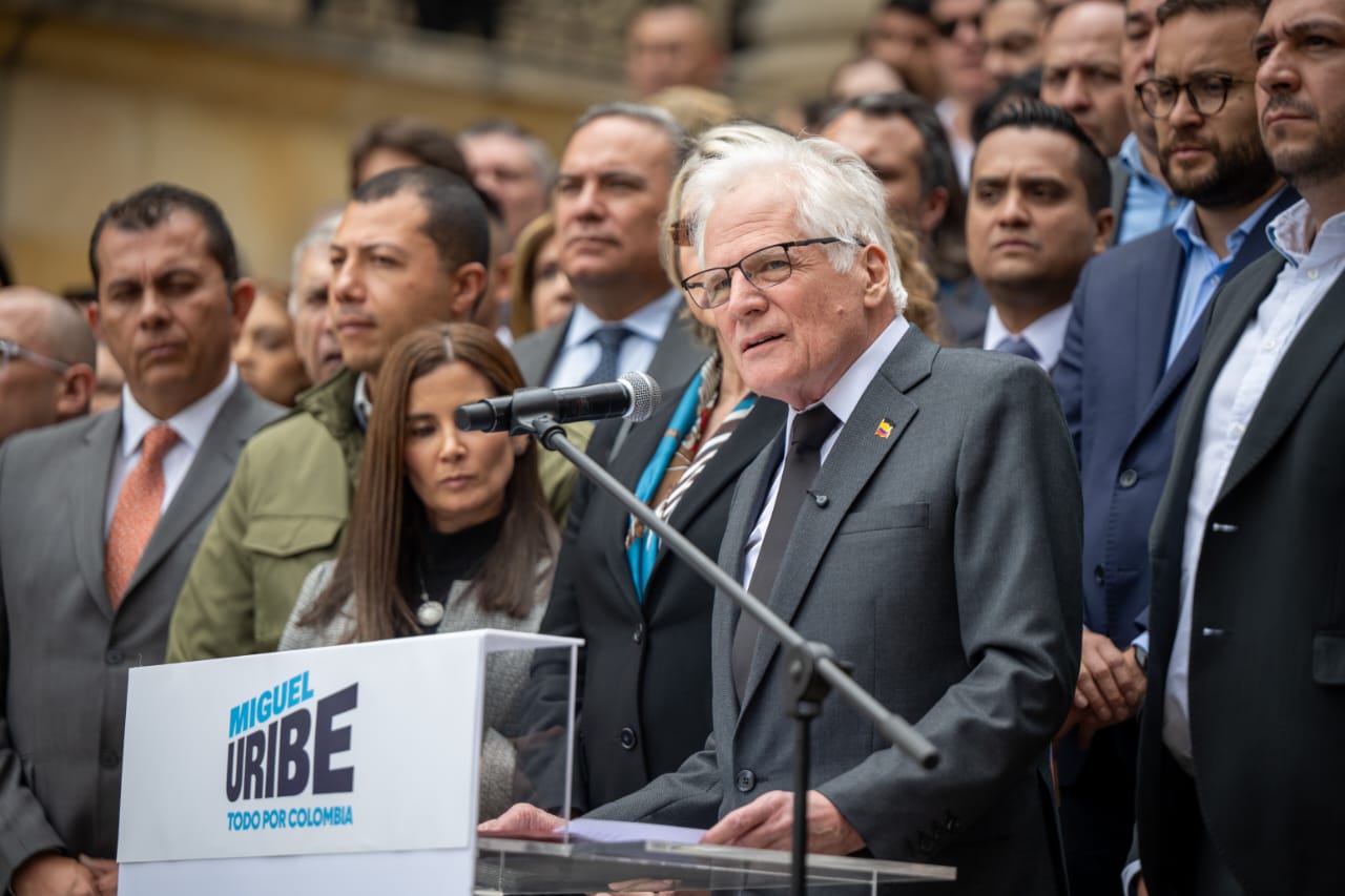 Frente a la Catedral Primada de Bogotá, Miguel Uribe Londoño, padre de Miguel Uribe Turbay, dio sus primeras declaraciones como precandidato presidencial, en las que resaltó que continuará con el plan de gobierno de su hijo y reiteró que no descansará hasta que no haya un mártir más en el país.