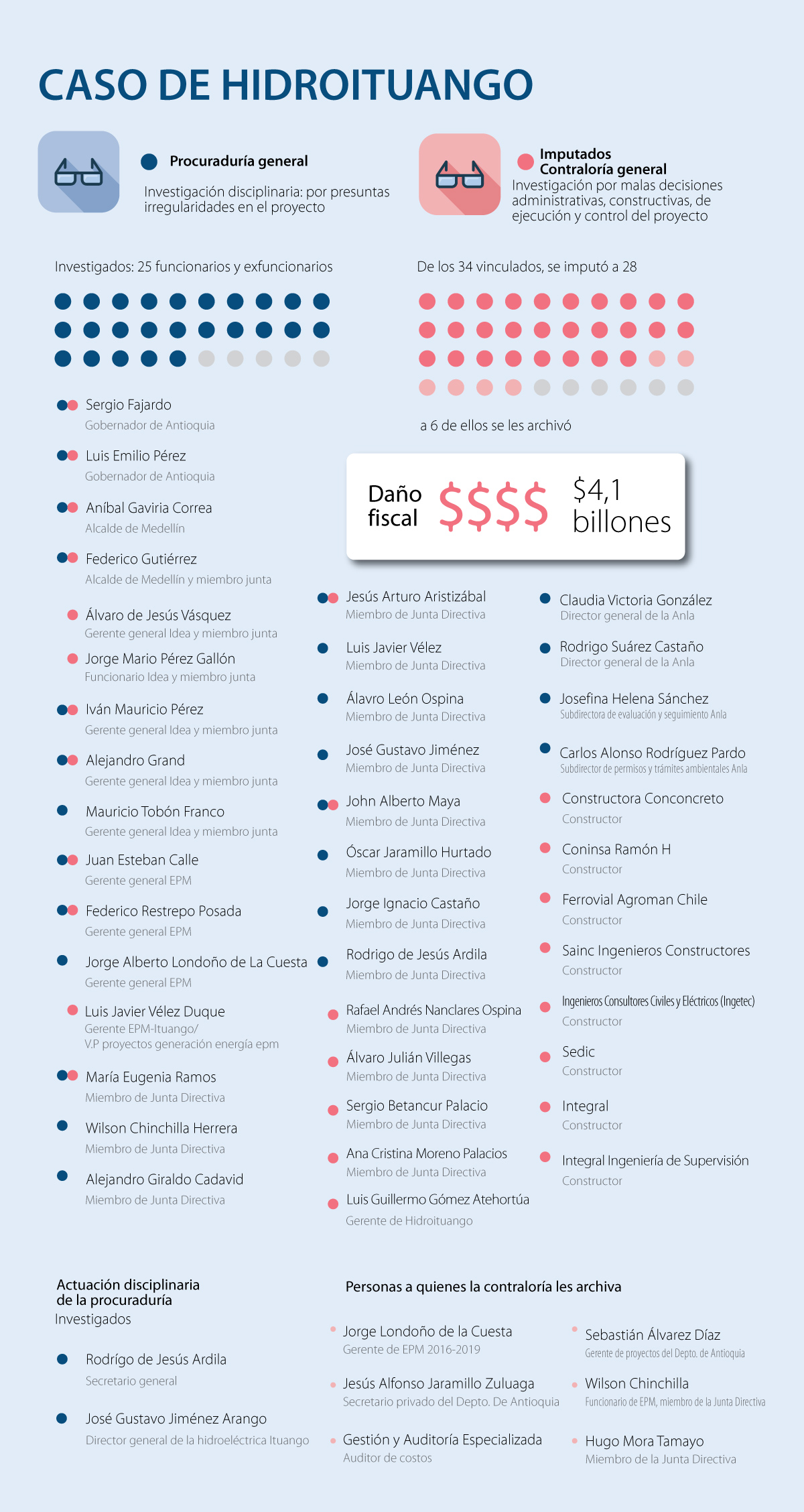 Los investigados son 25 funcionarios y exfuncionarios, entre los que están: Claudia Victoria González Hernández y Rodrigo Suárez Castaño, directores generales de Anla; Josefina Helena Sánchez Cuervo, subdirectora de evaluación y seguimiento Anla; Carlos Alonso Rodríguez Pardo, subdirector de permisos y trámites ambientales Anla; Sergio Fajardo Valderrama y Luís Emilio Pérez Gutiérrez, gobernadores de Antioquia; Aníbal Gaviria Correa y Federico Andrés Gutiérrez Zuluaga, alcaldes de Medellín y miembros principales Junta Directiva Hidroituango S.A. E.S.P.; Iván Mauricio Pérez Salazar, Alejandro Antonio Granda Zapata y Mauricio Tobón Franco, gerentes generales Idea y miembros principales Junta Directiva Hidroituango S.A. E.S.P.; Juan Esteban Calle Restrepo, Federico Restrepo Posada y Jorge Alberto Julián Londoño de la Cuesta, gerentes generales EPM.