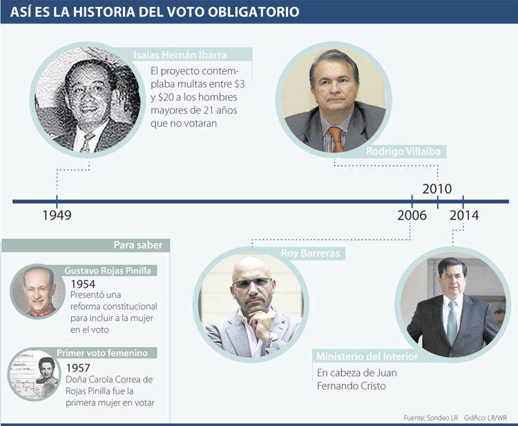 El tema no es nuevo y la insistencia viene desde 1949, cuando el representante a la Cámara y primer esposo de la cantante popular, Helenita Vargas, Isaías Hernán Ibarra, en compañía de seis personas más, presentaron la propuesta que pretendía obligar a los sufragantes a asistir a las urnas. Hace 65 años se quisieron imponer multas desde $3 hasta $20 a los hombres mayores de 21 años que incumplieran con el ejercicio del voto.
