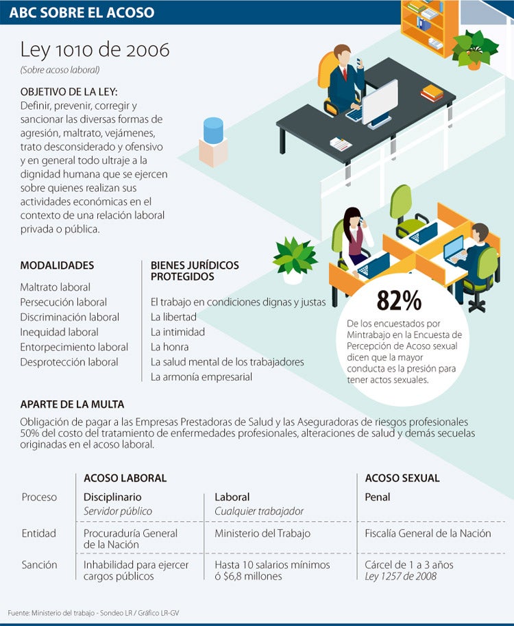 En Colombia, el acoso laboral es penalizado por la Ley 1010 de 2006; y la persona culpable debe pagar una multa de hasta 10 salarios mínimos vigentes, que representan $6,8 millones.