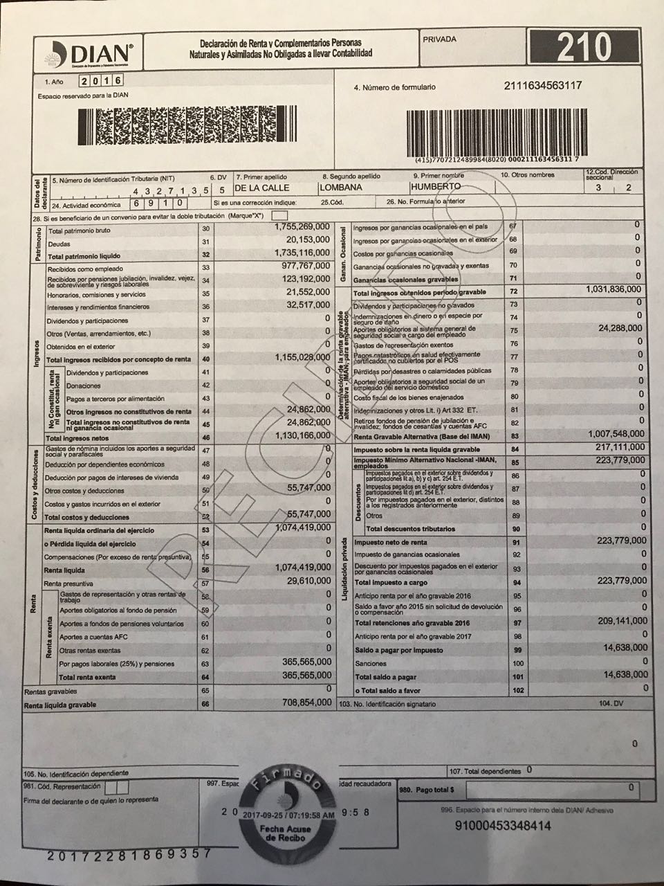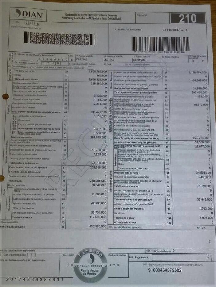 La declaración de renta de Germán Vargas Lleras muestra que el candidato declara que tiene un patrimonio bruto de $2.695 millones, y reporta que como deuda tiene $463.000. A los tributaristas les llamó la atención que en costos y deducciones, Vargas Lleras pone en el renglón de vivienda $15,7 millones, lo que indicaría que está pagando una hipoteca de una casa o un rubro similar sobre el que paga intereses. A eso se le suman otras deducciones no especificadas por $7,8 millones, lo que arroja un total de $23,5 millones de deducción. El candidato, además, deduce aportes a cuentas AFC por $42,9 millones, y logra una renta exenta de $112,6 millones. Unos dicen que es uno de los buenos administradores.