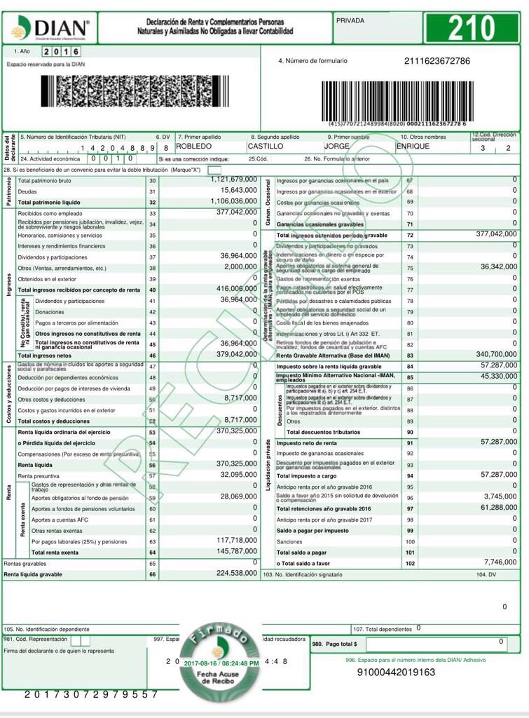 La declaración de Robledo muestra un patrimonio bruto de $1.121 millones y una deuda de $15 millones. Es decir, su patrimonio neto es de $1.106 millones. De acuerdo con el exdirector de la Dian Horacio Ayala, que en las declaraciones no se pueda saber con quién es la deuda o a qué corresponde el patrimonio bruto es un impedimento para conocer detalles del manejo de las finanzas que tiene el precandidato. El líder del Polo también declara dividendos y participaciones, es decir que debe ser accionista de alguna sociedad que le genera ganancias adicionales. Sus deducciones son por $8,7 millones, pero no pide más en otros renglones como cuentas AFC o fondos voluntarios de pensión.