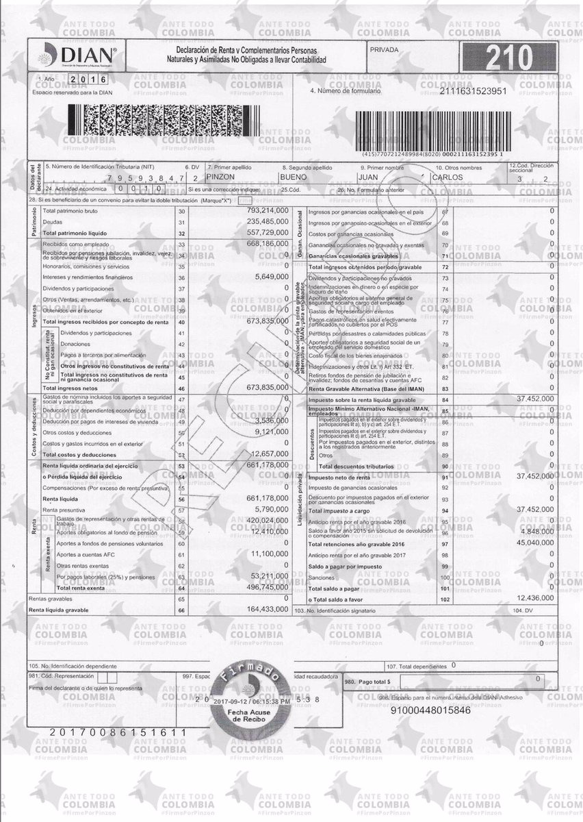 A finales de octubre de este año el precandidato y exministro de Defensa, Juan Carlos Pinzón, dio a conocer su declaración de renta y la de su esposa, e invitó a los demás aspirantes a la Presidencia a que hicieran lo mismo, “convencido de la importancia de hacer política fundamentada en valores, con transparencia y honestidad”.