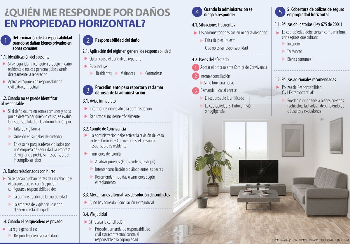 Según Leonardo Leal Ahumada, abogado y especialista en derecho comercial de la Universidad del Rosario, todo depende de si se trata de un bien común de la copropiedad o de una pertenencia de propiedad privada. “En el caso de un automóvil, si el parqueadero es de la copropiedad y el daño se produce por el hurto de una parte del vehículo o por negligencia de la administración, y no es posible identificar al responsable, es la gerencia de la copropiedad quien debe asumir la reparación. Ahora bien, si el parqueadero es privado, en primera instancia debe responder quien causó el daño”, aseguró Leal Ahumada.