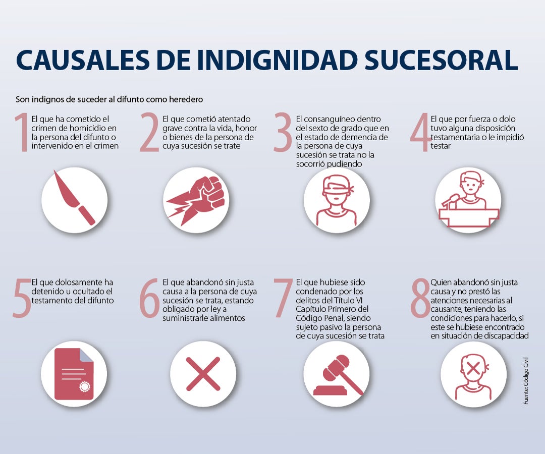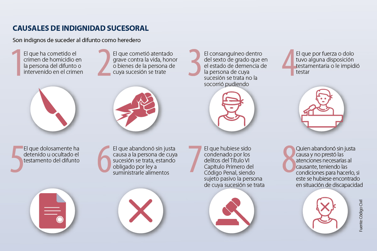 Tales comportamientos reprochables se encuentran enunciados en el artículo de 1025 del Código Civil, que establece que son indignos de suceder al difunto, entre otros: el que ha cometido el crimen de homicidio en la persona del difunto o intervenido en el crimen; el que cometió atentado grave contra la vida, honor o bienes de la persona de cuya sucesión se trate; o el que dolosamente haya detenido u ocultado el testamento del difunto.