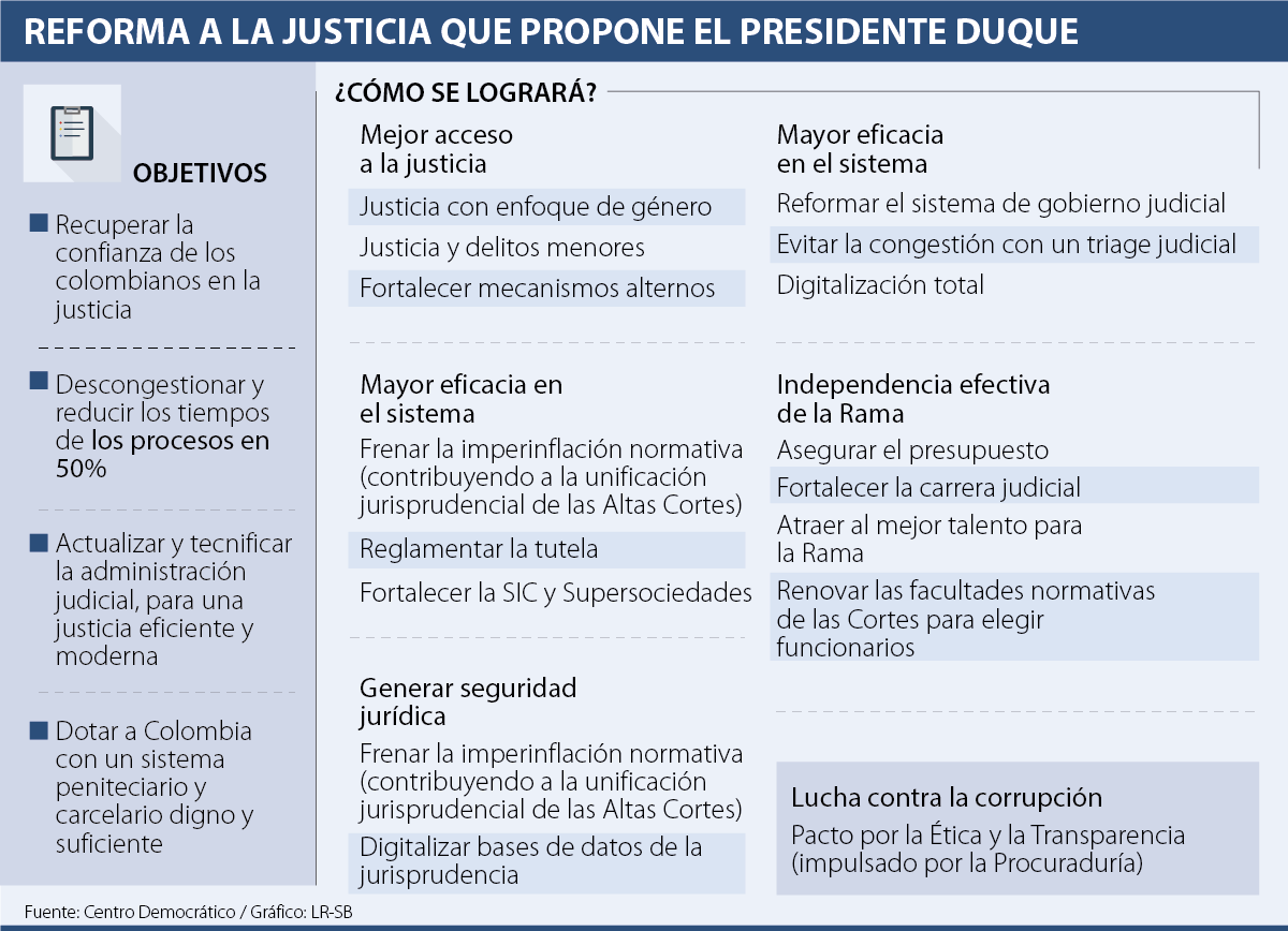 Pero, cómo será dicho proyecto que reformaría la Rama Judicial. Según con lo dicho por el mandatario durante su campaña a la presidencia y lo publicado por el partido Centro Democrático en su página web, la transformación tiene como temas clave el fortalecimiento de las primeras y segundas instancias, el aprovechamiento de la tecnología para facilitar los procesos judiciales, búsqueda y mantenimiento de nuevos talentos para la Rama Judicial, frenar la hiperinflación normativa, la derrota a la impunidad, la lucha contra la corrupción, garantizar la dignidad carcelaria y que sea eficiente y evitar las preferencias para los delincuentes de cuello blanco.
