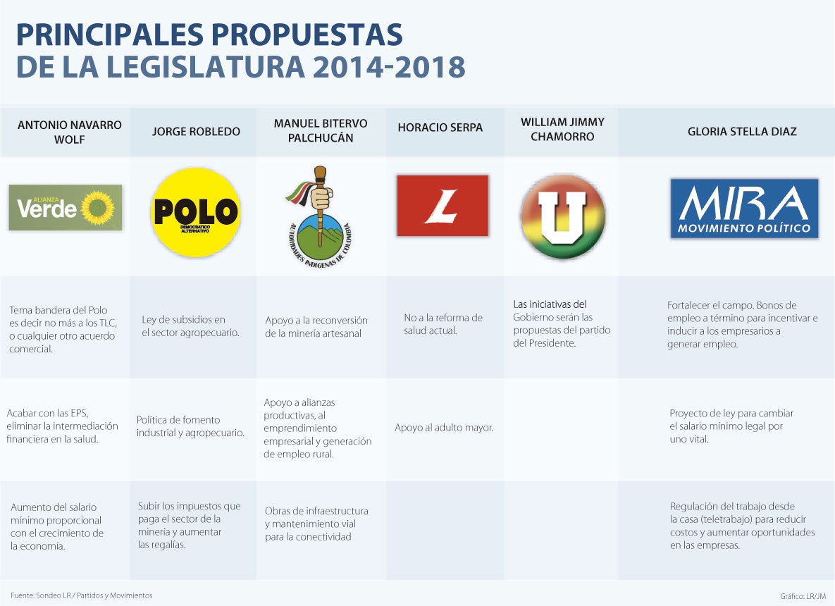 LR consultó a las colectividades en carrera y obtuvo las respuestas de las cabezas de lista al Senado de la Alianza Verde, el Polo Democrático Alternativo, La U, Autoridades Indígenas de Colombia (Aico) y el Mira. El Partido Liberal entregó poca información a través de voceros de prensa del candidato Horacio Serpa Uribe, quien nunca contestó; mientras que el Conservador, Cambio Radical y Centro Democrático no atendieron las llamadas.