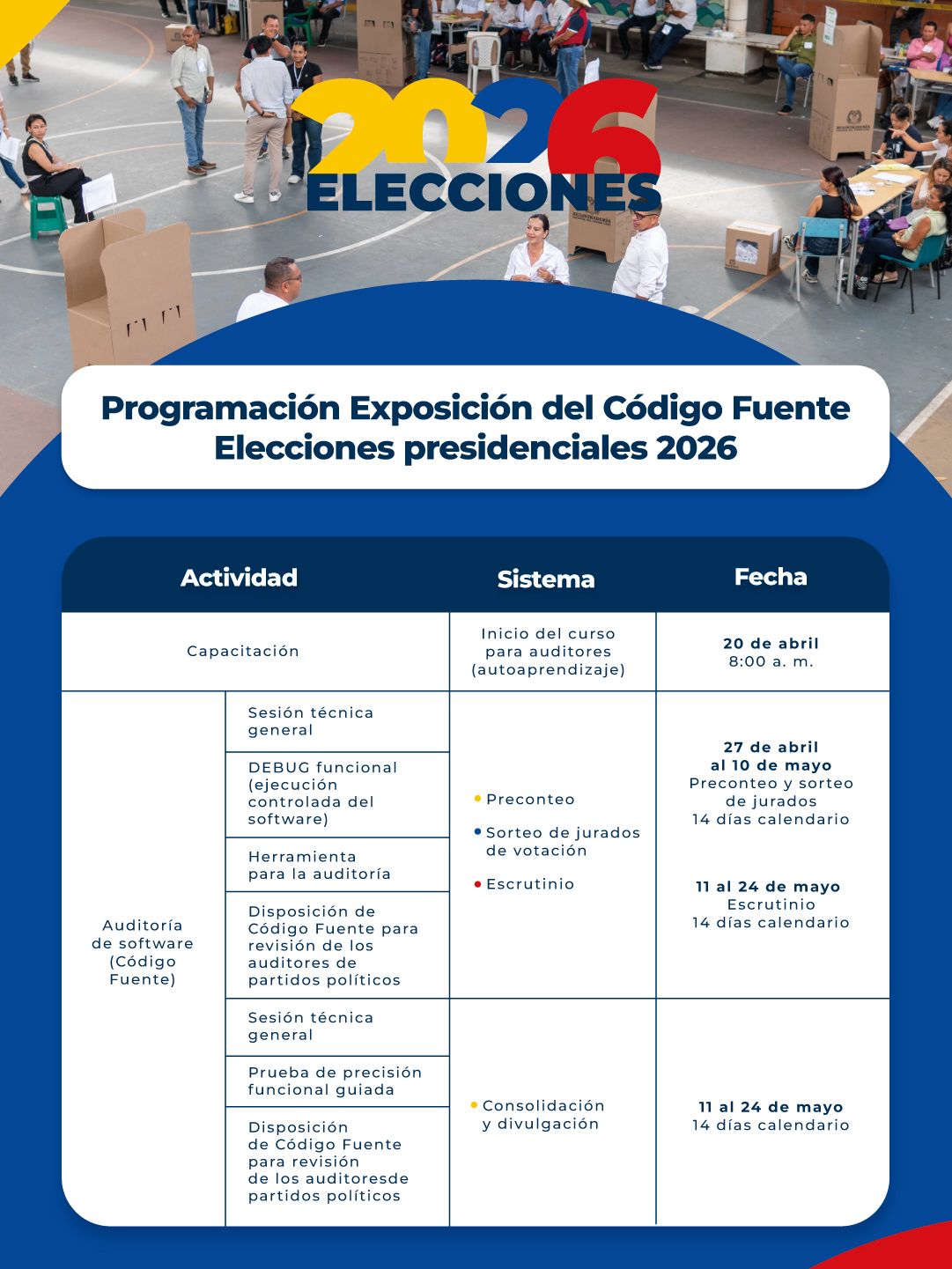 Adicionalmente, el registrador informó que el censo electoral se cerrará el 30 de abril y la capacitación de aproximadamente 860.000 jurados de votación iniciará el 3 de mayo. La entidad enfatizó que el acceso al código fuente permite a los técnicos de los partidos verificar la lógica de programación y los controles de seguridad del sistema.