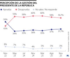 Luego se ubicó el sistema judicial, el cual obtuvo 56,7% de desaprobación, con un aumento de 2,5 p.p. con respecto a agosto de este año y una disminución de 6 p.p. en comparación con marzo. Así mismo, este resultó ser el segundo periodo con desfavorabilidad más baja desde mayo de 2017.