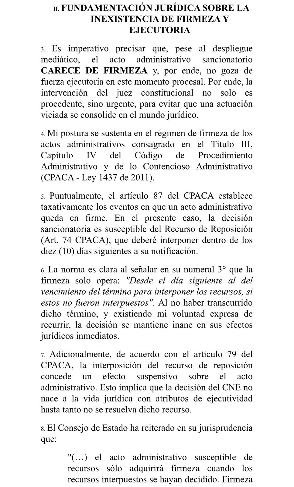Sobre este punto, también avocó al artículo 79 del Cpaca, el cual establece que el recurso de reposición da lugar a un efecto suspensivo sobre el acto administrativo. "Esto implica que la decisión del CNE no nace a la vida jurídica con atributos de ejecutividad hasta tanto no se resuelva dicho recurso", precisó Roa.