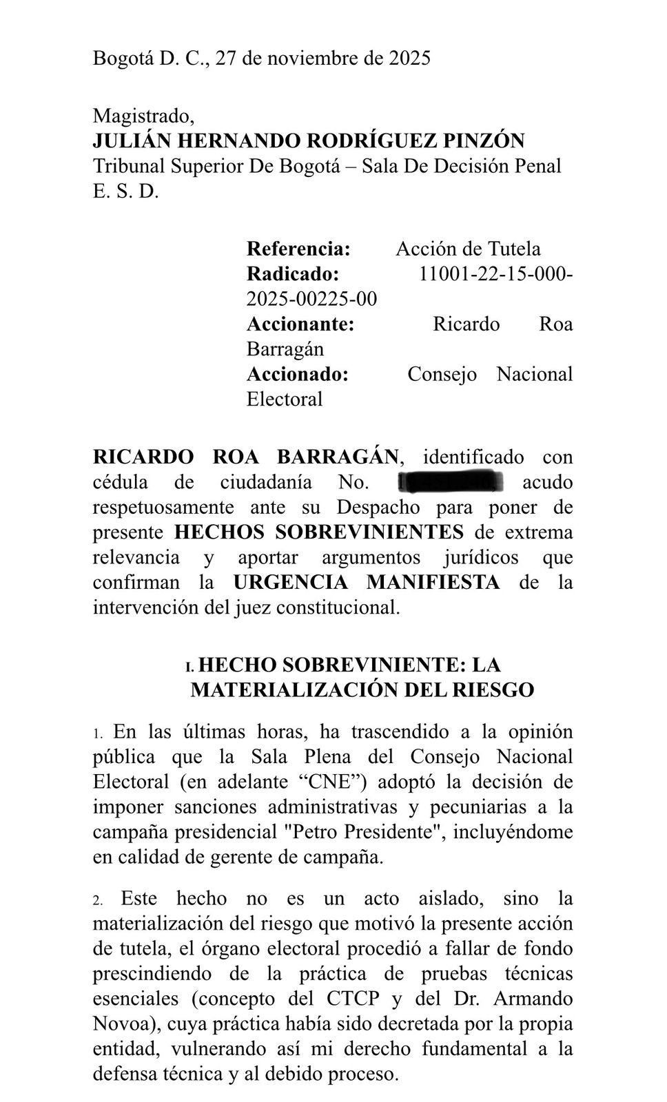 "Acudo respetuosamente a su despacho para poner de presente hechos sobrevinientes de extrema relevancia y aportar argumentos jurídicos que confirman la urgencia manifiesta de la intervención de juez constitucional", se lee en inicio del documento.