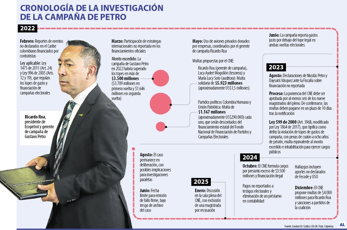 Desde la perspectiva administrativa, Ricardo Roa, en su calidad de gerente de la campaña presidencial, se enfrenta a sanciones económicas impuestas por el Consejo Nacional Electoral, CNE, que podrían ascender a más de $5.000 millones. Estas estarían compuestas por la obligación de devolver los recursos excedentes y el pago de multas sustanciales. El proceso se enmarca en la potestad sancionatoria del organismo electoral para imponer correctivos de carácter pecuniario por las infracciones a la normativa de financiación de campañas.