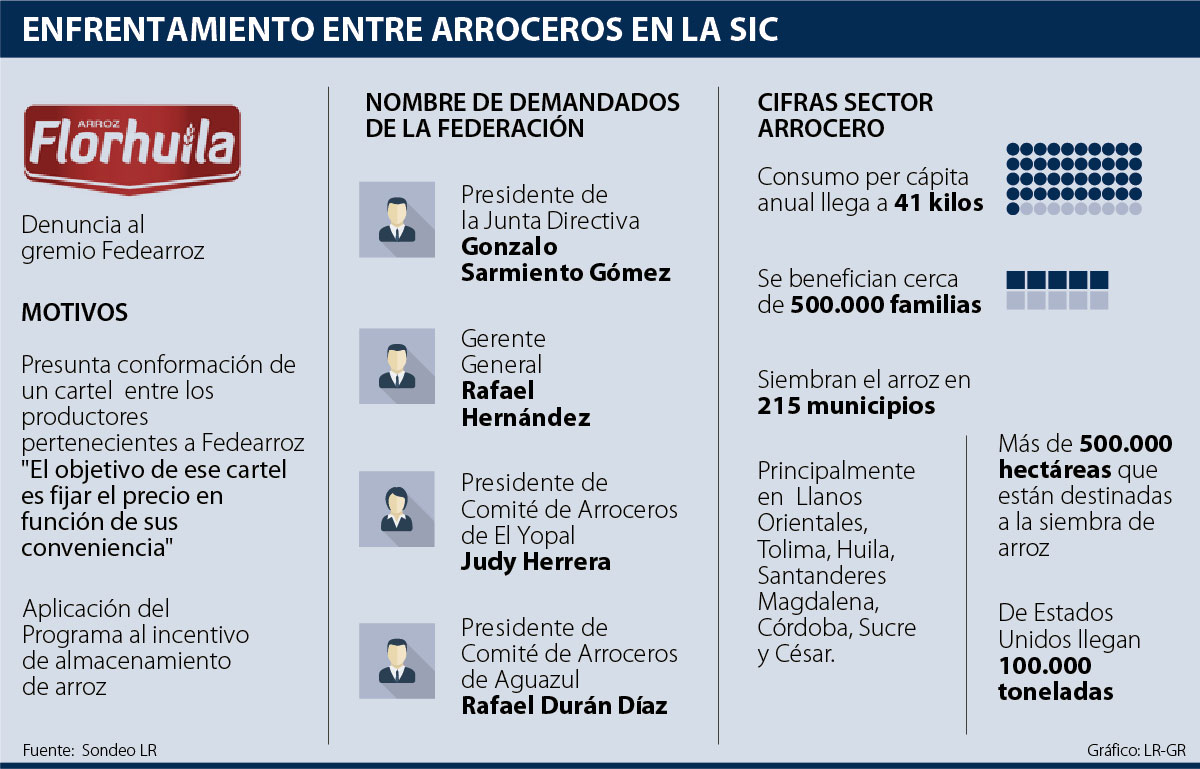Como personas naturales fueron denunciadas Gonzalo Sarmiento Gómez, presidente de la Junta Directiva de Fedearroz; Rafael Hernández, gerente general; Judy Herrera, presidente del Comité de Arroceros de El Yopal; y Rafael Ernesto Durán, presidente del Comité de Arroceros de Aguazul.